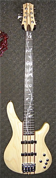 Ravenwest RB800 has vine inlay, 5 pc neck thru construction v/p/b/m/t controls. No case but I dare say I could get one.