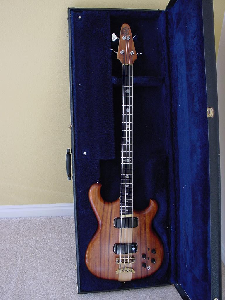Four string 32 Spoiler with solid koa body sides and the standard three-piece maple neck. SN 82S2345.  Picked this one up to get a feel for the neck and electronics before ordering a custom.  The previous owner told me the bass went back to Alembic in '99 to get Signature electronics installed though the factory couldn't confirm it.  Hasn't been out of the case in over a year since I got my first short scale.