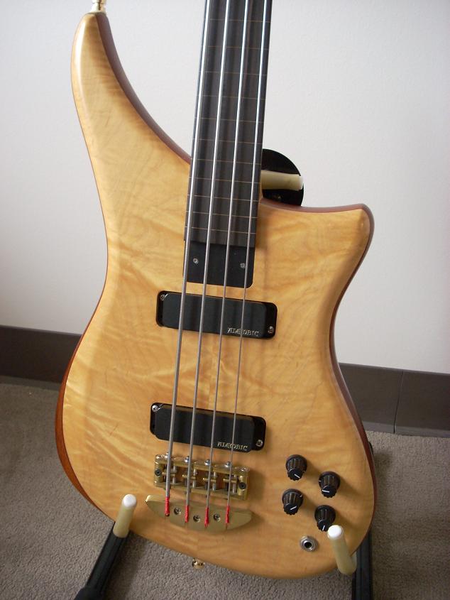 $1300 plus shipping gets you a fine Epic of the fretless variety. (I'm also willing to trade for an upright bass, and have a rickenbacker for trade bait as well.)   Specs:  Figured maple top, purpleheart accent laminate, mahogany body.  Neck is 3 piece maple.  Ebony fingerboard with maple lines.  Currently strung with Thomastik flats (you know you love them!) in BEAD tuning.  There are a couple of dings and whatnot, as expected for a 10 year old instrument, but nothing severe.  Overall it's in great condition.