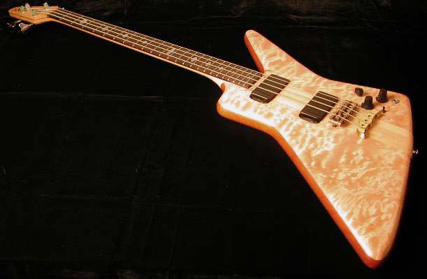 VERY VERY lovely quilted maple top, all maple down the center.  Walnut core.  Medium scale.  Sounds amazing, of course.  Currently set up to accommodate standard gauge Rotosounds.