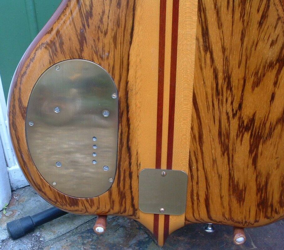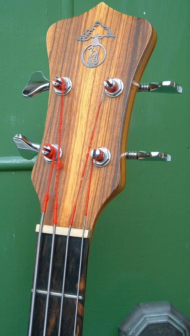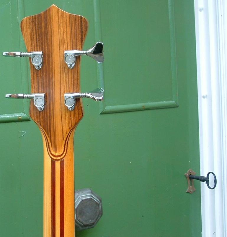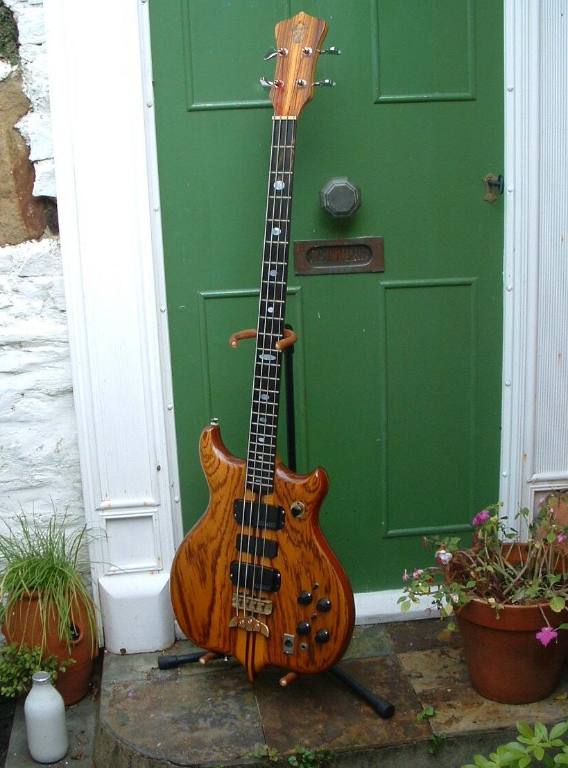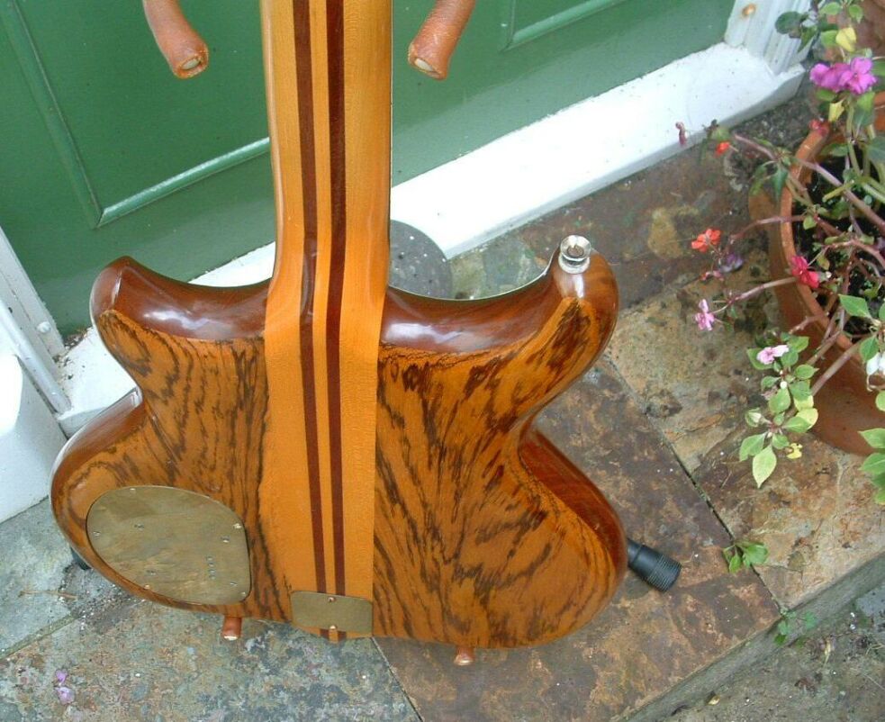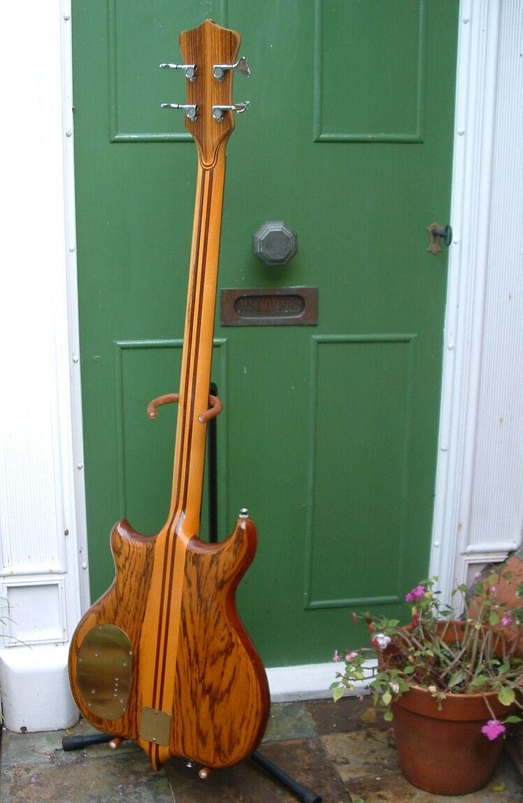 This is what I consider a prime example of an early Alembic long scale, Series I bass in flat sawn zebra wood, fronts and backs, with a standard point body. An obviously well-cared-for beauty!