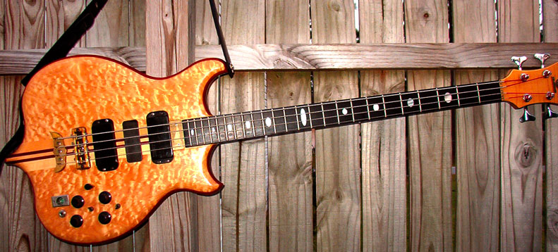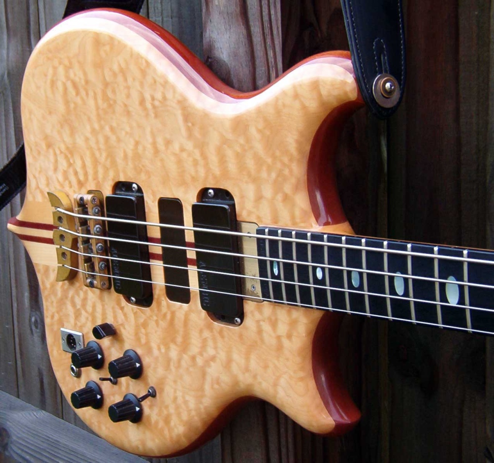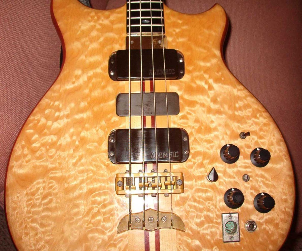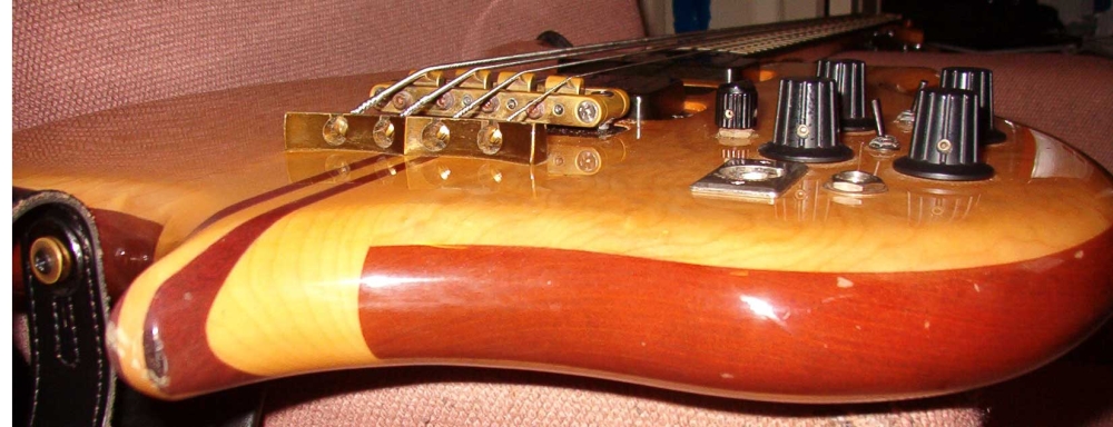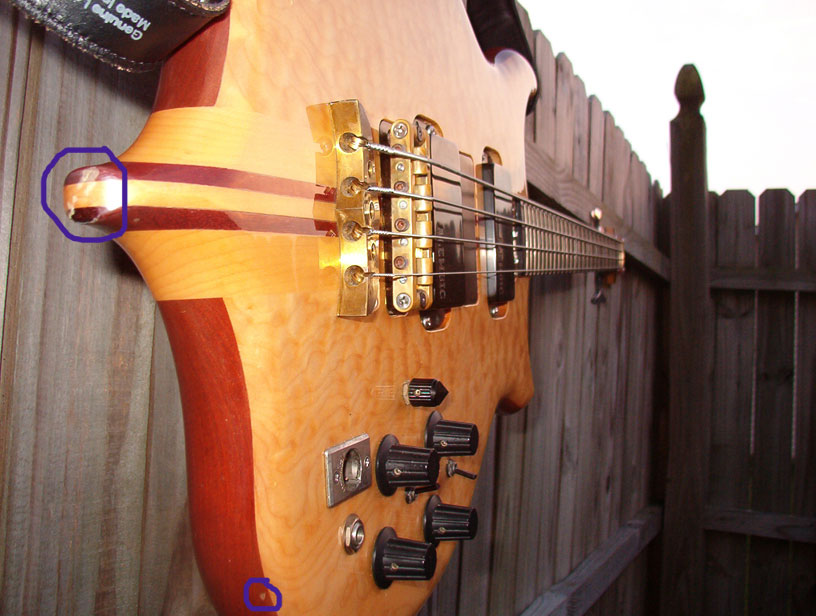 Here's the situation.    I have a love/hate relationship with my Series I.  I purchased it in early '91 from the original owner who honest to god kept it in a closet and never played it for almost 3 years.  He was always out of town on gigs and never home and he couldn't stand the thought of taking his new Alembic on the road so he took his old "road weary" Alembic instead.  As a result, I was able to purchase this bass in perfect condition.  Here are the details on the bass from Alembic (http://club.alembicguitars.com/Images/393/7391.html?1073428388)  ------------------------ 1988 4 string series I bass quilted maple top & back mahogany body maple/purpleheart neck oval mother of pearl inlays brass hardware gotoh tuners quilted maple headstock veneer clear gloss finish completed 7/21/88  ------------------------  I honestly do love this bass.  It's my baby but I hurt my back badly when I was young and I've never been able to comforably play this bass.  The 34" scale mixed with my less than average height mean that I have to really reach for the first 3 frets.  Half way through a set my left arm hurts from being out of position and the next day my back is telling me that I stood a bit too long with a big ol' Series I around my neck.  So here's what I'm "thinking" of doing.  I want to get a 32" scale bass and there's no other choice but Alembic for me so I'm thinking about selling it to finance the purchase of a 32" Mark King Balance K Omega but I don't know what I can reasonably expect to get for my Series I.    As far as imperfections go...  Case - I've got the original case and it has a bit of wear and tear but nothing all that bad.  DS-5 - The DS-5 has had the power cable replaced and the mono/stereo switch replaced.  Series I - The bottom tip of the horn has a couple of blemishes on it and there is one very very tiny pin dot of a scuff on the end side of the bass.  I've circled these in blue in the second photo.