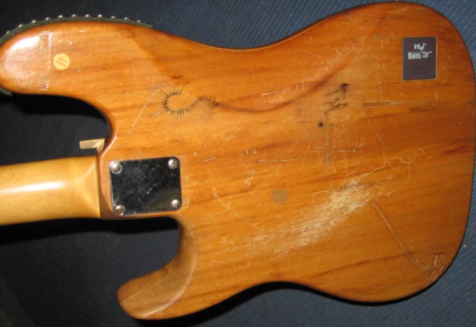Thank you Will - for me it's the yin and yang factor. I own a beautiful Distillate and it is balanced by this monstrousity - it's ugly, it's HEAVY and it has the face that only a bassist could love. :-)  The brass rods are the longest thumb rest ever, the images in black are wood burned into the surface. A shot of the back shows that it has an honest to god Intel 486 chip in it, you can also cleary see where I modified the lower bout for easier access up high on the neck. On the top of the upper bout is one of our cat's old collars - the black leather with studs was very appropriate for this instrument. Of course more wood burning and some gouges that occured when Dan Huber got at it,,,, but that is another story for another day.  peace!