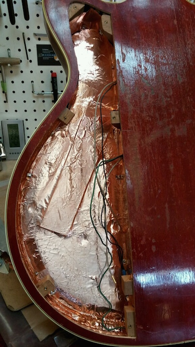 So, armed with that knowledge, I decided to see if I could take things a step further. The luthier, Matt at Woodsongs, who had installed my Alembic pickups had very carefully, and with a large amount of skill, had shielding the pickup cavities. It was a thing of beauty. But, heeding the words of Ron, I yanked all that stuff out of there.
