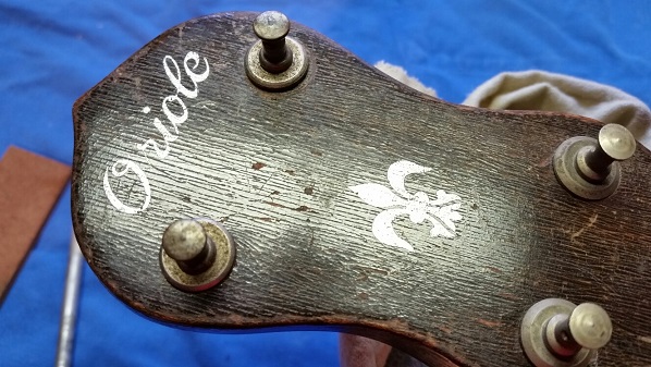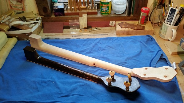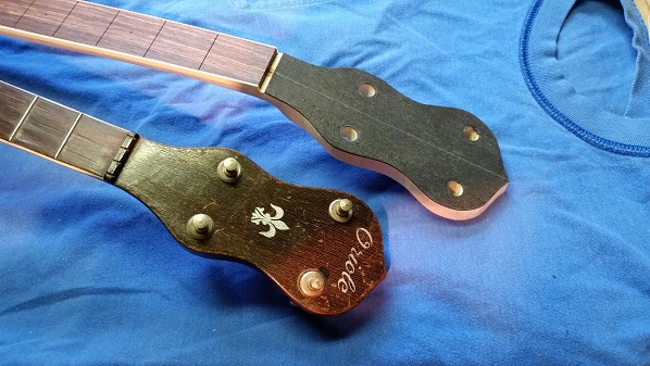 Some of you that have read my rambling posts know I spend a fair amount of my free time in a shop working on musical instruments, a hobby I picked up from my Dad thirty-some years ago. I put up this thread http://club.alembicguitars.com/Images/449/210467.html?1435634821 one time about a few banjos we built together years ago. Occasionally we still collaborate on a project, though not as much in the past couple years. Busy? you know, life gets in the way. Anyway, opportunity recently presented my Dad with some time to work in the shop again, and that being the case, it?s time for another shop thread.  The Project: an ?Oriole? tenor banjo, made by Gibson in 1926. Like many other makers of the day, Gibson made musical instruments for sale through places other than their dealers, and simple re-branded them under various names? ?Kalamazoo?, ?Cromwell?, ?Tru-Jo?, ?Kel-Kroydon?, and ?Recording King? to name a few more. ?Oriole?, as I understand it, was a Montgomery-Ward catalogue brand. This particular model was essentially a re-badged TB-0, their basic tenor banjo offering, fairly plain, though still very good quality.  Not many folks play tenor banjo anymore, but around the mountains of Southwest Virginia, if you shake any good-size tree, a half-dozen banjo players will tumble out? at least two of them will be very good players. The others? well, it?s best if you move them along before the neighbors notice, or worse, more banjo players suddenly get the idea it?s cool if they hang out at your place. Call the cops if you must, or just lure them offsite with a sausage biscuit or cheap beer.  The sticking point here, there?s literally no difference between the pot assembly (the round, drum-like part) of a tenor banjo and a regular, long-scale five string banjo, but the necks as you can see are radically different. This project is a typical conversion, from four-string short scale to five-string long scale. Thousands of these been done on Gibson tenor banjos - so many in fact, it?s actually pretty hard to find a pre-WWII Gibson banjo with the original tenor neck. This project is a little weird, because this model was so plain that most would overlook it in search of the fancier higher-end models from the same era to convert.   Starting with the neck: Here?s the original neck, and the roughed out new one. They are the same basic construction, with maple, and a rosewood fretboard. We?ve already installed a two-way truss rod, although we put it in backwards so the access is in the heel instead of the headstock. The original had no neck reinforcement by the way, though it probably didn?t need any, as tenor banjo strings are very light gauge. We?ve also glued the ebony headstock veneer on before sawing out the shape to a template made from the old headstock, and drilled the holes where the tuning pegs will go. (sorry, no pictures? hey, it?s just a few minutes with a bandsaw and drill press. I?m basically just trying not to cut off any bass-playing fingers or end up with some extra holes)