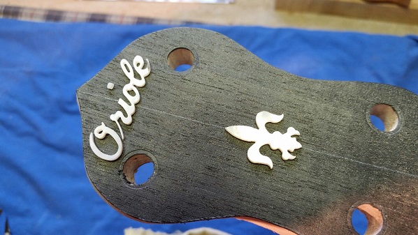 Haven?t updated in a while, but work on the Oriole tenor-to-five conversion is galloping along. Here's how the inlay in the headstock turned out: