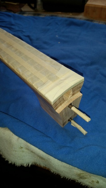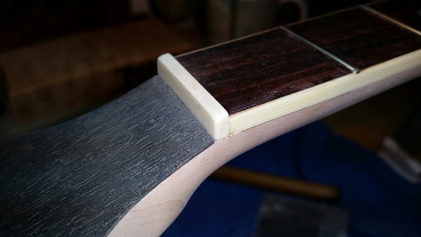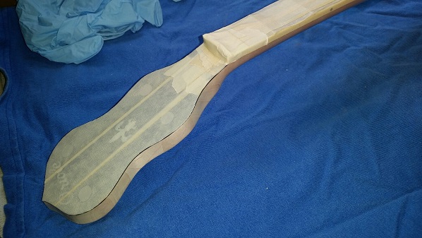 Almost time for some finish? I?ve done all the finish sanding, and ?raised the grain? twice. This is where you wet the wood, causing the grain to swell, then sand it smooth again. Makes for a very smooth surface to apply finish, especially with maple.  Since this neck is going to be stained a chestnut brown, I have masked up the binding for the airbrushing process. It?s an alcohol-based stain, that will bleed if you?re not careful.