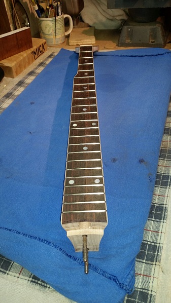 Dad came over one night last week, and spent the evening installing the frets. He didn?t like the way they were hammering in, so he routed the fret slots a touch deeper, and glued the frets in a few at a time. Duco cement is a wonderful thing? just don?t inhale it. Here's all 22.