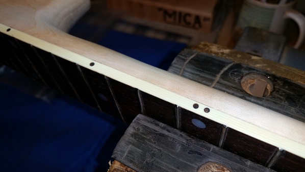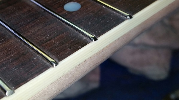 Since this neck is bound, each fret end had to have the tang nipped and filed, so the fret can overlap the binding. Not necessary, but looks sharp when you take a little extra time.    After the glue set, I dressed all 22 of them so they?d be perfectly level, then re-crowned them. After that, I use a 3-corner file with one bur ground off, to round over the fret ends to a bullet shape, then polish each fret. See the difference?