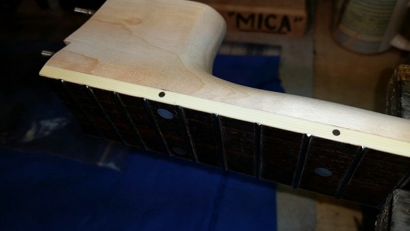 Oh yeah, gotta' have spikes. Those sliding fifth-string capos are worse than a tangle of clothes-hangers. =) Dad's very particular about how they're installed though, and usually does that last-thing, after final assembly and setup.