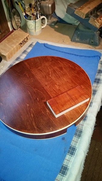 Here?s the resonator that I?m trying to match color to? I always use a block of same-same wood to test my colors with, even some clear finish so the true color is analyzed. Colors distort in different light, so it?s important to look at the match from as many angles as possible. Natural sunlight is best, but a good ol? incandescent work lamp suits me fine.