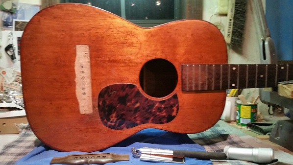 Years passed, like maybe 12 or 13? the singer and I got on speaking terms again, and I got the ?Peggy? guitar back. After a little tweaking, she was back in good order, this time with some new faux tortoise pins, and a brand new set of Stew-Mac?s ?Golden-Age? vintage replacement 3-on-a-plate tuners, in relic?d nickel finish. I even replaced the tattered wooden pickguard with a faux tortoise one to match the pins. Peggy was ready for another home, so I gave her to the young man who plays fiddle in my band when he went off to college. Peggy saw him through a degree in Engineering from Virginia Polytechnic Institute. (better known as Virginia Tech in the world of collegiate sports) Recently he came into a very nice old Martin 0-21, made in 1921, which he was able to afford due in part to being gainfully employed by virtue of that Engineering degree - and sent Peggy back home for some bridge work. I?m almost done with her? glued the new bridge on last night actually. Might see if he minds me keeping her for a while? I?ve enjoyed looking back at some of my early work, and thinking about what Mr. M. Jade would think if he knew his guitar was still around.
