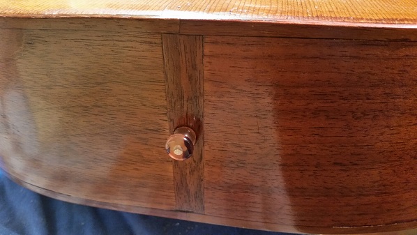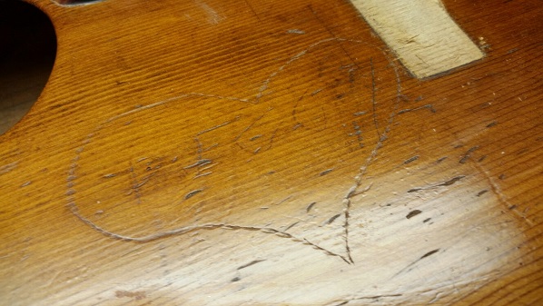 It was a mess, both inside and out? tuners were shot, many cracks, loose braces, plus the center seam of the back was separating. And it was still dirty, and still smelled a little like a goat barn. I knew that wasn?t gonna? score me any points, with the cold-hearted singer with the beautiful voice, so I started by a good cleaning. What? You didn?t seriously think ^that^ part was gonna? have a happy ending? (it kinda? did, but that?s later... MUCH later) After cleaning the years? worth of scuzz off, this charming feature appeared? someone, sometime had scratched the name ?Peggy? into the top, and carved a heart shape around it. I thought - awww? ain?t that sweet! Dude probably had about as much luck with Peggy as I did with the singer, but whatever. Hint guys ? never, ever scratch your love interest's name into a guitar? it doesn?t work, at least not the way you think it will.