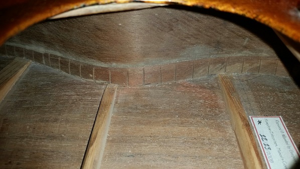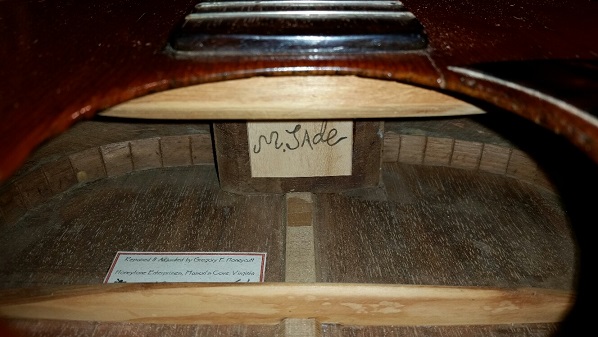 Anyway, that?s about when I started to realize just what a gem the trash truck guys had saved. This little guitar I had assumed was a run-of-the-mill, catalog guitar was actually a hand-made instrument, that didn?t bear much resemblance to any known maker. The back and sides were walnut, the back was even quarter-sawn and bookmatched. It had a spruce top, a mahogany neck, and a rosewood fingerboard, even rosewood binding, and an inlaid endpiece to hide the joint. It had the strangest bracing pattern I'd ever seen, something between a A-frame and an M... it was very rigid to say the least, but in all the right places. It had an odd shaped bridge clearly made to resemble a Stauffer style one but without points, and a straight uncompensated saddle. It even had homemade wooden bridge pins. Based on how sturdy it was built and how wide the string spacing was, I?m pretty sure it was meant to be played lap style, like a Hawaiian slide guitar. This much is certain - it was definitely not the first or only attempt at instrument building, whoever had made this had obviously advanced skills. Upon disassembly, I found the name I presume to be the maker, and a date scrawled inside on the treble rib, deep inside where it would never be seen? M. Jade ~ 1927. Don?t bother googling, nobody knows.