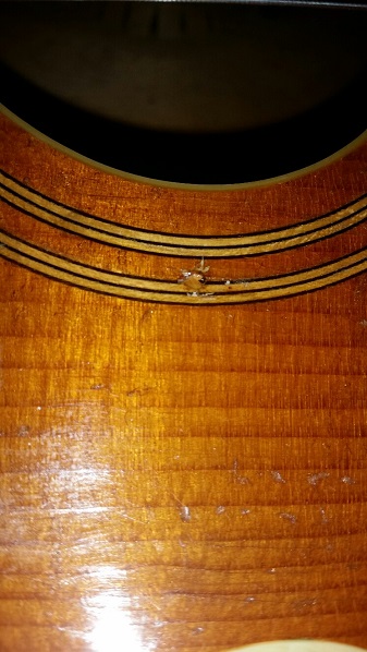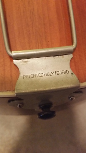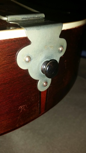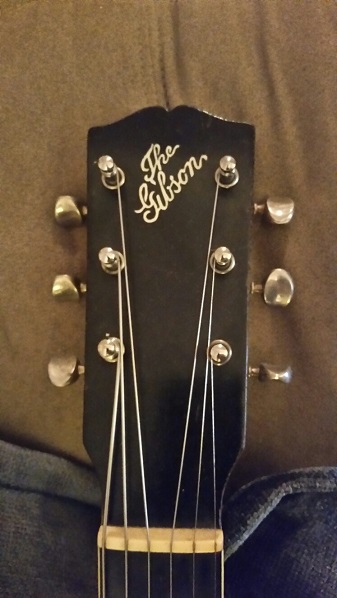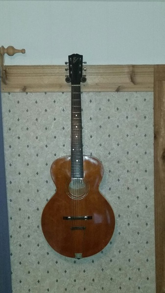 This little gem belongs to a lifelong friend, who left it in my custody back in 1999. It needed some minor repair? back when we were kids (and sweethearts? :blush-blush she used to play the guitar, but gave it up in college in favor of choir. It?s been in her family since new, her great-grandmother?s actually. Her Dad also played it, and it?s rumored he was the guilty party behind the telltale holes through the rosette where a pickup was mounted. Anyway, we met up in Lexington, Kentucky one time while I was on the way to play a show in Louisville another hour and change away. I brought the guitar home and fixed it up? I remember fitting a new bridge as the original one was sagging badly. Maybe there was a loose side seam too. Next time we got together, she sang and played a tune on it, then handed it back to me? I?ve had it ever since.