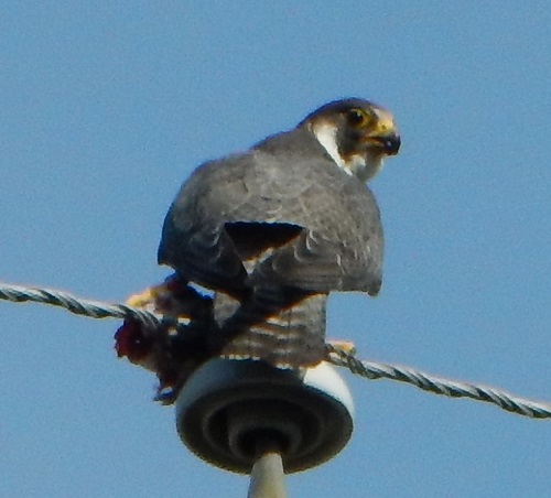 The dive-bomber pursued it and kept 'attacking' whilst the queaker kept a queaking.  After several passes the queaker was dislodged from the roof and went out of sight, the 'attacker' also went out of site.  Now the bird with the prize starts quocking (a lower pitched queak if you will) but again rather rhythmic and certainly loud.  Somewhere during this I went inside and grabbed our camera;  I started to video the quoker and watched as it rhythmically quocked and started pivoting in a circle atop the electrical pole. As if it were calling out to at least one of the other Peregrine's.  After a short video shoot (hopefully the quoking is faithfully reproduced) I switched the camera to 'picture' mode so that I could zoom in and get some hopefully nice shots.  Well our camera makes  a 'beep' when a picture is taken, the bird heard the beep and turned towards me and became silent.