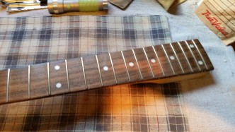 Another seemingly tricky step was relocating the slot for the nut, the truss rod slot and the 3 holes for the truss rod cover. Using the old nut as a guide, and the old truss rod cover as a template... zip - done. My Dad called stuff like that "Old Indian Tricks". I will probably make a brass nut & truss rod cover, another nod to both Alembic and RT.