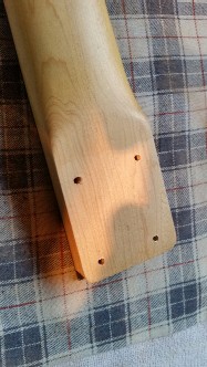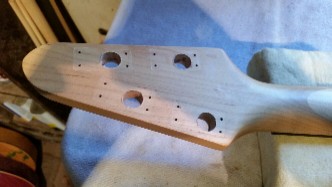 So like I said, the whole point is a five-string conversion, but the headstock has four holes for tuners, and another sixteen holes in the back for mounting screws. The tuners were junk, so I pitched them in a parts drawer right off. There's no veneers on the front or back of the headstock, which is good, saves me having to peel them off. I drilled out the existing holes to an exact 5/8ths diameter, then carefully cut four pieces of 5/8" maple dowel. Mixed up some five-minute epoxy with some dust from my bandsaw, and used masking tape to secure the plugs in place until the epoxy set. Using toothpicks, the screw holes were plugged too. Afterward, I flushed up the front and back of the plugged headstock on the belt sander, taking about another 1/16" from each face. That's the hardest part, since the belt sander would destroy the fingerboard. I had to sand it off turned 90 degrees. Nerves of steel, lock-pickers touch, done.  Seriously, that was a tricky step, that you won't find in the luthier's handbook, and might get you reprimanded or fired from Alembic. =)