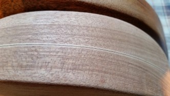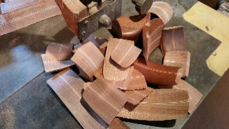 I didn't have any time for whittling this weekend, but for good reason - GIGS! Well, that, and spring has finally sprung here so the fifteen things I needed to do around the house won the battle for attention. I did go up to the shop to ponder and sketch for a few minutes. Now that the neck is ready, the next step is the body. Keeping in mind, this old body is work I'm not particularly proud of, being big and chunky, (incredibly heavy) and a wacky shape on top of that. But all that aside, the core is solid walnut, which if I recall correctly was salvaged from an old table. (literally a coffee table bass!) The laminations are maple and walnut, and were mostly decorative, but also provided a way to book and flip-match the wings of the body. It was not my first time ever doing laminations... Dad taught me how to strengthen a banjo neck by laminating a sandwich of alternating wood in between the two bookmatched halves of a neck. On our earlier instruments, this was all the reinforcement we used. Here's a little tease of the next set of installments... a good size pile of scraps on the bandsaw table and a close in look at the body viewed in profile.