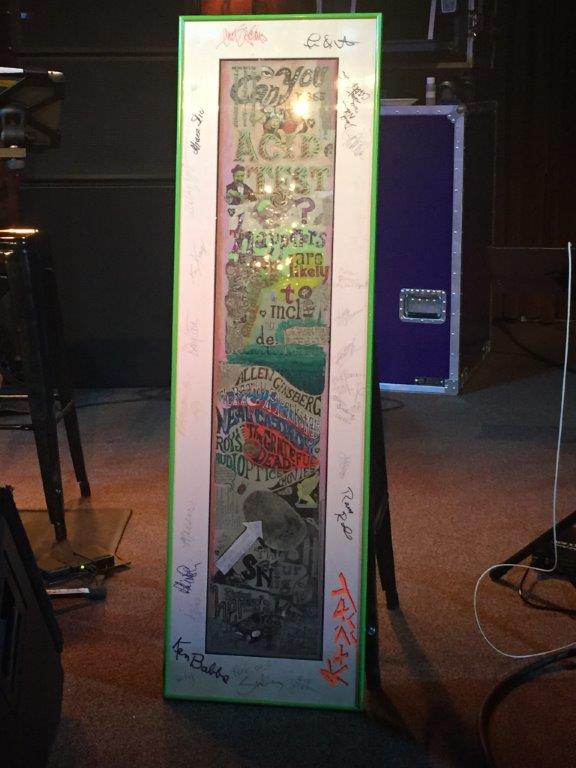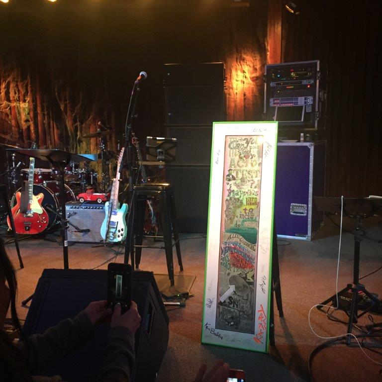 This was the first in a series of shows honoring the 50th anniversary of the Dead. I entered the Grate Hall at 7pm after a very nice dinner and wound up in the second row, right in front of the man. Got a real good peak at Khaleesi and a framed original "Acid Test" poster, hand colored by Bear and signed by several noteworthy participants which was on display in honor of the evening: