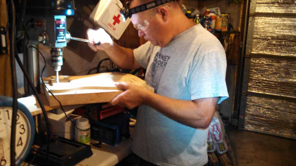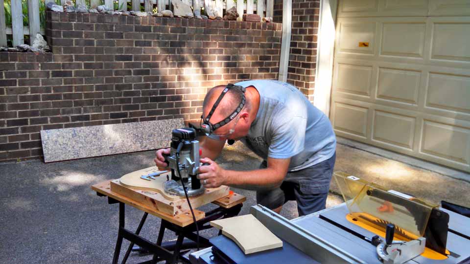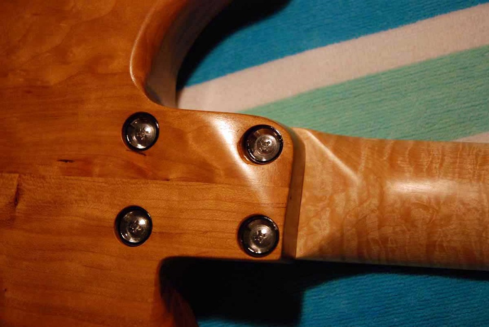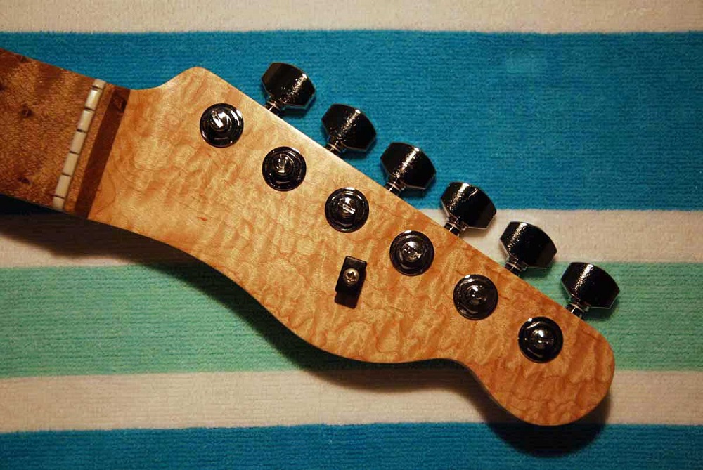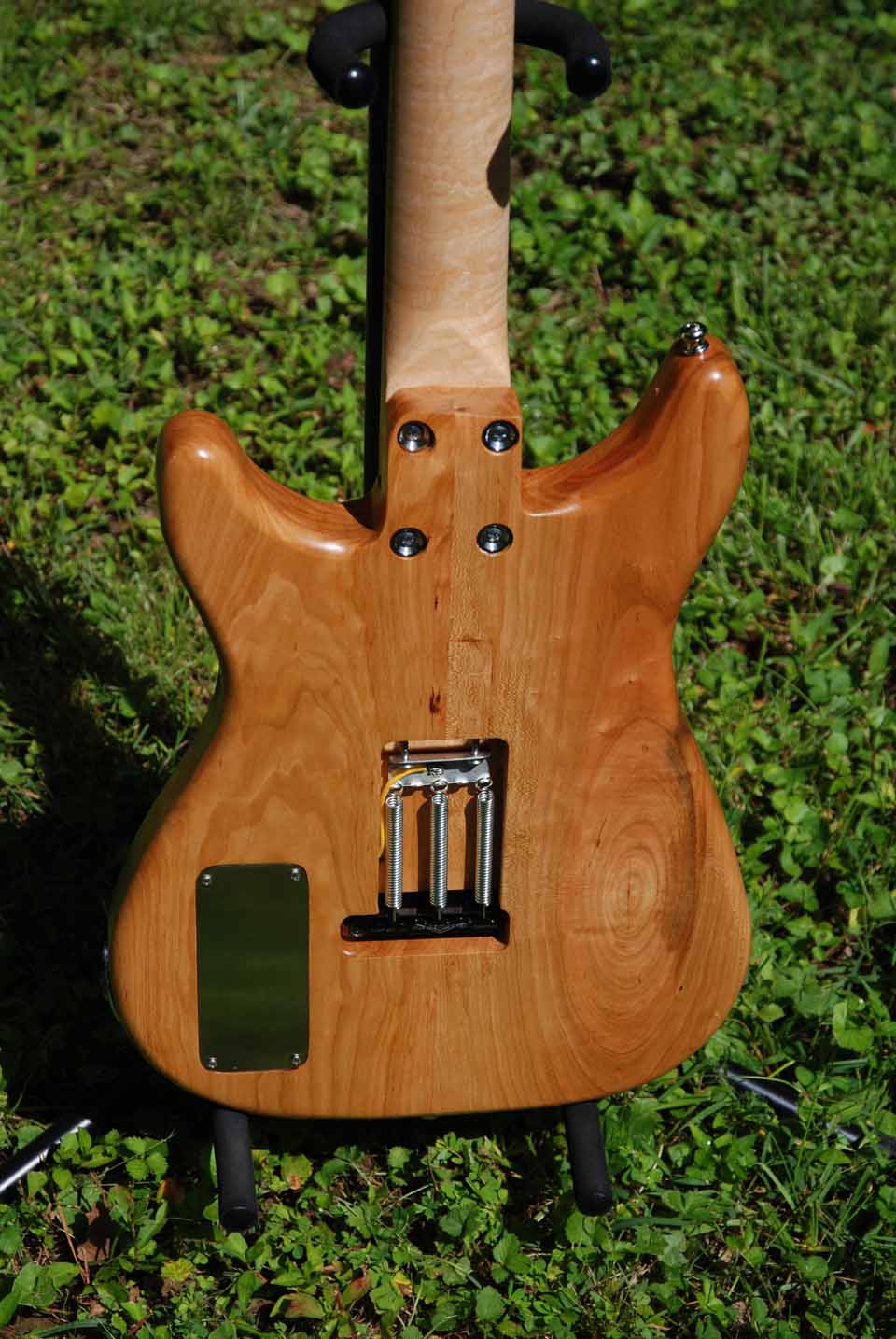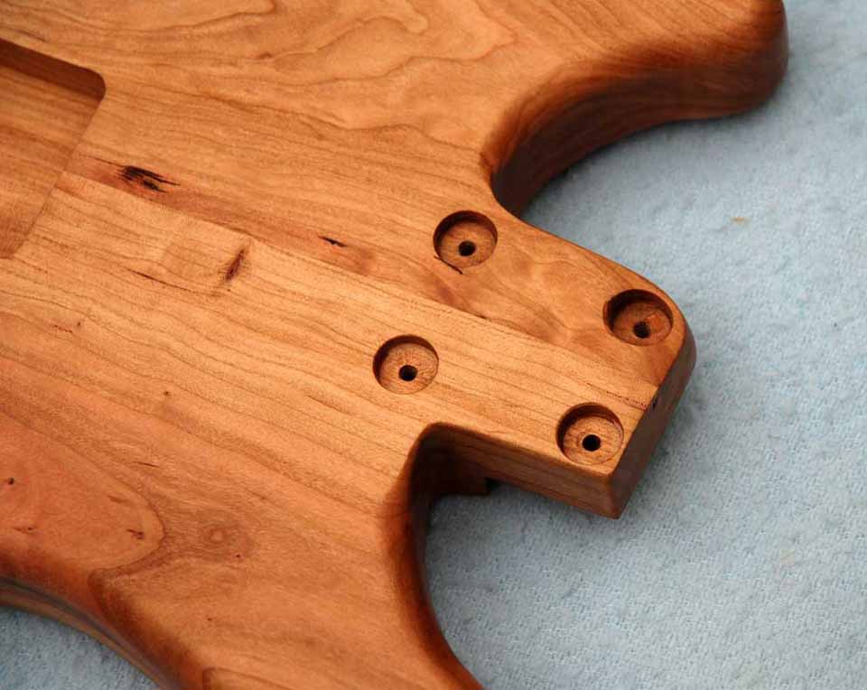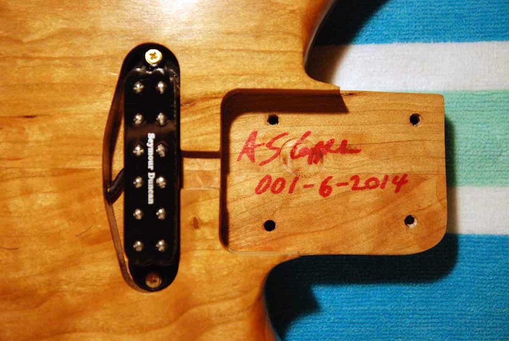 This project was started by fate, I assume. Through the acquisition of a partscaster Tele, I started looking at and joined the TDPRI forum. My favorite of the forum is the threads about homemade guitars. Through these pages, I thought, ?I can do that?. After all, I took woodshop in college and owned a table saw and router. The only problem was the other tools. Well, my next-door neighbor has a wood shop, as do a couple of other friends. I also had recently amassed a pile of wood. January 2013, an EF1 tornado went through my mother-in-law?s neighborhood. She lost 5 cherry trees, and I had the logs taken to a mill nearby. The intention was to make paneling for a future basement music room. Most was cut to 5/4 thickness. But luckily, some was cut to 6/4. My son and I began going through the pile, still air-drying with spacers in the backyard. We pulled a few good looking boards, and the wood was stacked in front of a natural gas stove in my basement for final air-drying. When I thought the boards were ready, we borrowed my neighbor?s planer. It?s a 13 inch Dewalt, just enough to plane the boards. After planning them, I glued them together to create two halves of the body. Yes ? it had to be made of 4 pieces. During this time, I really wish I had cut some thicker boards. But now the problem, my neighbor was always going out of town or to busy to get in his shop to plane the sides for final gluing and planning. So, another friend let me use his shop. He has a huge jointer, at least 8 ft long and 8 inches wide. So in about one minute, I had both sides ready for gluing. A couple of weeks later, I used his 15-inch Powermatic planer, an awesome machine. And then I had a body blank. Mean while waiting to make the body blank, I made some templates out of MDF board. I patterned the body on a Fender Lead II that I have had since about 1983. One template was for the body itself and the other was for the neck pocket. I made mounting holes at the pickups that would allow for placement without movement. I also copied the single coil template to the MDF board. Because I wanted a tremolo, I got some templates and router bits from Stew Mac. I also got a 1-inch Bosch template bit for the body routing. The neck pocket was made using a Musikraft Telecaster neck that I lucked up on Craigslist. I had always liked Tele?s, especially the headstock. And I found a deal on a beauty - $200 and it was unused. It?s flame maple with a roasted birdseye fingerboard and 6105 frets. It was ?finished? with the thin lacquer sealer. And for now, it?s going to be used with that finish. I polished it up a little with a white Scotch Brite pad and waxed it. And while everything else was slowly taking shape, I started procuring parts. I already had a Duncan JB Jr pickup for the bridge. It was from a trade a while back. So I decided to get a matching little humbucker ? a Duncan Little ?59. I wanted to keep it simple, so I went with Tele wiring with a mini-switch. As for tuners, I really like Gotoh?s. I found a good deal on their locking mini tuners that have adjustable post heights. Lastly, I started looking for a tremolo. I thought I would try something different. So, I got a Super Vee Blade Runner. This would be easier to mount, since it uses the 6-string mount ? except that they only use 4 holes. Back to the body: the weather finally cleared to allow for routing in the driveway. So one Saturday, I headed out and started. The first step was to do the neck pocket. This was to make sure it was inline with the body center. I used blocks of wood clamped to the blank to make the sides and end of the neck pocket. I first predrilled holes to remove some wood so the router bit would not have to work as hard. Next was the rough cut with a 40-year-old jigsaw. Wow that took a long time. This was followed up with the 1-in. bit on my router following my template edges. Then it was following the previous route. This was followed with the ? in. round over bit which smoothes over the edges of the body. This was the coolest part of the work. It is really starting to look like a guitar. Did I mention how nervous I was routing the chunk of wood that took so much effort to make? I had never done routing at this level, except for some lettering for signs for a mountain bike trail project. And they were with a sign template. It was so cool taking my ?guitar? in the house and showing everyone. So far, only one slight oops on the neck was along a corner of the pocket, which was where I needed to make it tapered anyway. Next came the sand paper. I went over everything. The round over need some work to blend it in and around the neck section routes. Sure would be nice to have some powered drum sanders. Starting to really take shape now. The tremolo route came next. I used the Stew Mac directions for a 6-hole tremolo. This was the scariest part of the routing. Everything was good so far. One slip up or a template shift, and I have a nice scrap piece of wood! But, luckily, everything went well. But I did have to re-route to allow for room for the tremolo block to swing. The routes for the pickups and control cavity came last. I figured if I made it to this stage, it would be OK to route these last. And again, good planning won! The last step was to finish the body. Since I like minimalist finishes, I went with a Tru-Oil gun oil finish. I had done a Warmoth Tele neck with this one time ? smooth as silk! The first two coats were awesome. The third started showing defects in my sanding. So, I spent an hour doing more sanding on the body. Well, this really paid off. The final results were awesome. The Tru-Oil worked perfectly. I think I did about 5 or 6 coats with light buffing with steel wool and Scotch pads. The last 2 coats didn?t seam to soak in very much, so I stopped. Final step, polishing and assembly, everything went pretty well with this final step. My friend Ray helped with the setup and the nut slots. She plays perfectly. The Super-Vee tremolo is amazi