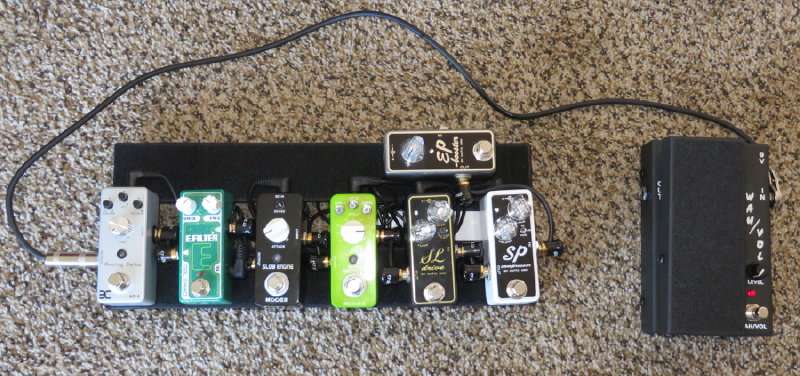 I got the Morley off Amazon.  $90.  Works quite well for what it is.  Only bitch is that the volume doesn't come on for the first third of the pedal travel, but I'm getting used to it.  The light green pedal is a Mooer Mod Factory with 11 different sounds, including phaser, auto wah, touch wah, flanger, tremolo, vibrato, chorus, etc.  Some of the sounds are pretty bad but several are useable.  I put the EP on top since I leave it on all the time - great pedal at any size.  The Slow Engine is a great copy of the iconic Boss Slow Gear.  The last one on the left is an Eno analog delay.  Costs about $30 new off of eBay.  I thought I'd try it on a flyer, but wasn't expecting much.  I was shocked at how good it is.  Even has a blend knob.