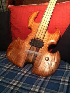This bass is made from some very nice substitute woods! The body is Chinaberry which is a Mahogany, the fingerboard is Persimmon which is a member of the Ebony family and is very hard, the neck is a 5 piece with 3 Persimmon lamenents down the middle and the other 2 are Walnut. All the wooods are local North Carolina woods which I think is pretty cool! It has a single MM style pickup and a single volume.
