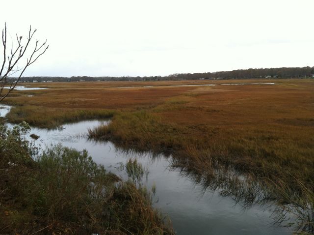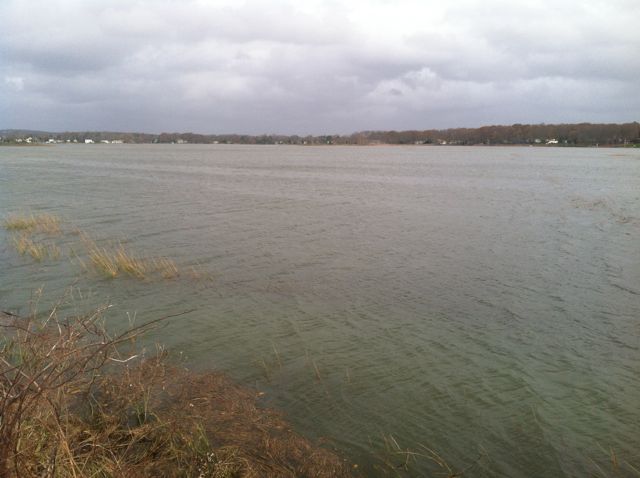 Alright, here's one of our marshes before and after the third high tide of the storm~ the first two covered the road, making no distinction between it and Long Island Sound: