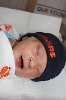 Thanks, all; to fill in the details, Oliver is male, 7 lb 10 oz (anyone's Alembic weigh less?), 20.5, and we have oix of him already wearing a Bears hat.