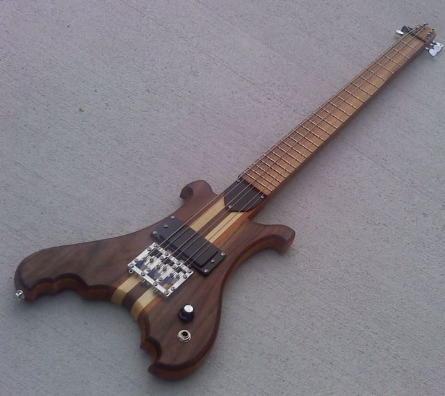 I have been watching Kevin's work for a couple of years, and knew I wanted him to build something for me. I took me a while to come up with this. I have always been intrigued by his one, two, and three string basses. After playing a Hamer 8 string octave bass at Truetone, I formed this idea.