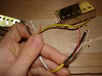 This is saying something about To wire the pickups as a standard humbucker, the red wire is hot and the bare wire is connected to ground. The white wire should be taped off so that it won't come into contact with other wires or components.