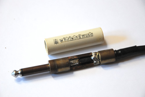 Left to right, a standard Switchcraft phone plug, Monster Rock, ProCo Guardian Blackjack, Mogami Silver, Whirlwind Ultrasnake.  The left and right ones are Switchcraft plugs, the Mogami is Neutrik.  I don't know who manufactures the two gold ones.  Here's a close up of that old Ultrasnake jack.  These were common as "the good stuff" back in the 70's and early 80's.  I can't remember the special name Switchcraft had for these, but it had some sort of catchy name.