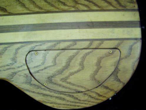 Yes, I put in a back cover when I built it. Attached are some images of the back cover and control cavity (which could probally use some wire ties). I also included a shot of the headstock which is vaguely fimiliar in shape.