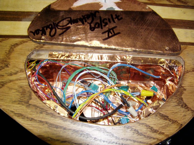 It's not a Starfire, nor does it have Alembic pickups but on one of the hollowbody basses I built, it has a Darkstar pickup and Audere preamp and I used copper flashing from Lowe's and just peeled off the plastic backing they use to allow it to be used with pressure treated lumber. Made a box for everything to fit in and soldered the seams. The nice thing about flashing is you can make the box and then fold it up to fit in the cavity and then unfold it once it's in there.