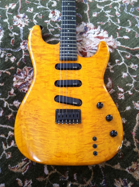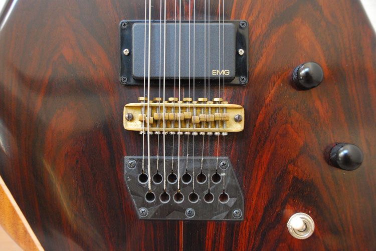 It's got a bit of an interesting story.  This guitar was built for Paul Kantner, but they made an error on the order and routed for two humbuckers instead of a single coil at the neck and a humbucker at the bridge.  You can buy EMGs that have single coil pickup guts inside a humbucker casing, but this was more about playing space between the pickups, so they built another one for him. It's a really thick cocobolo top with a maple accent layer and mahogany body.  Before anybody asks - no, there's not a giant knob sticking out of the middle of the neck, that's the guitar stand that it's sitting on!  This one has an unusual neck pickup, a "Geoff Gould special" custom made by EMG.  It's got two coils, but just one magnet (one air coil).  It sounds really cool, with sort of an "airy" tone, not like anything else.  Works really well with the 12-string. The other pickup is a stock EMG-85. The bridge was an old Stars Guitars bridge and the tailpiece was custom cut out of a graphite plate: