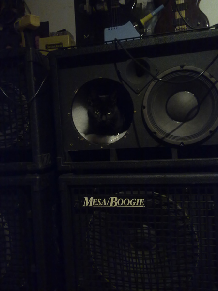 Bassicaly: Clean signal from wireless system directly into channel 2 of the Bass 400, or through the Fuzz/Wah pedals into channel 1 (pedals switched by Patchmate) There's a non returning signal path to the tuner (on pedalboard) so the tuner preset is always muted. From the Bass 400 the signal goes through the effect processors into the Stereo Strategy 400 (processors also switched by the Patchmate) Signal from the Bass 400 is clean (no effects) or with fuzz/wah and goes into the 15 inch cabs. Signal from the Strategy is the signal from the Bass 400 + when needed stereo effects and goes into the 10 inch cabs I managed to blow up a 10 inch EV speaker, while waiting for the replacement Spyker (one of my cats) Showed how brave she really is: