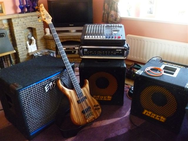 Yes Mark Bass worth a try.  Here is my stuff which I mix and match.  The mixer is not anything to do with my sound - just another job I have to do! There is an EBS 2x10 not shown.  The EBS cabs are a bit heavy these days at 26 and 28 kg but a great sound with the HD350 whereas the Markbass stuff comes in at 17 and 18.5 kg.  The Markbass combo is nice on it's own. The HD 350 is great with the Markbass 15. Mesa is wonderful gear(good enough for Paul McCartney) but hugely heavy.  They don't even put the weights in their descriptions. Glynn