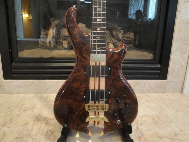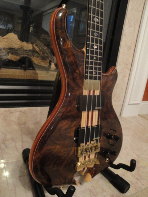 The wood does look like that sample, but my bass predated (2004) the posting in the wood bank (2006).  At first I wasn't too crazy about Walnut, but I now have 2 of them (this and my Brown Bass).  The figuring can range from subtle to REALLY outrageous.