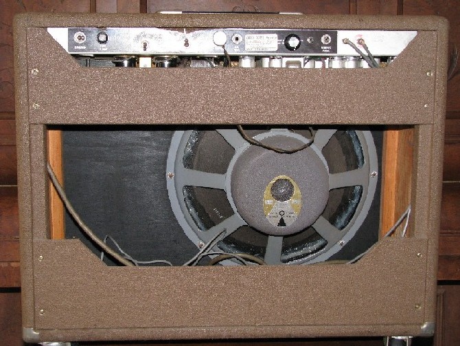Crobbins: That looks like a D-130F in either a Vibrasonic? or Bassman? I'm not sure on the brown amps but I know the tweeds (a year or two older than that one) had the baffle boards attached top and bottom only. Your amp has supports all the way around. In any case I believe it's a retrofit.