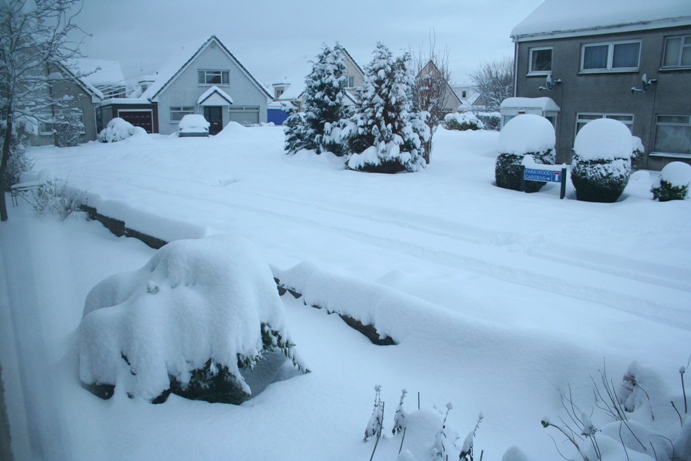Terry. The weather's got really bad here again. When I left the house around 7.30 the snow had just started up again after the weekend so I was able to get my daughter to her work in livingston. However, as soon as I started heading towards Edinburgh it got really heavy and the traffic ground to a halt. After arouond 2 1/2 hours I managed to get home again. I guess I managed about a five mile round trip. It's not stopped snowiing all day so I'm a bit concermed about how I get Heather home - the buses gave up around 8.30. here's what the street looks like from the safety of my dining room...