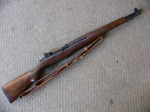 This is a 1942 Winchester-made M1 Garand that has been restored and re-stocked in Bastogne Walnut.