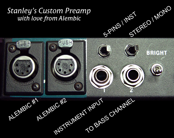 He can plug 2 Alembic Series I basses in and another bass (either stereo or mono) in the 1/4 input. He uses the standby function on the Alembics if he wants to use another bass in the 1/4, then he needs to select mono or stereo for the 1/4 input function.