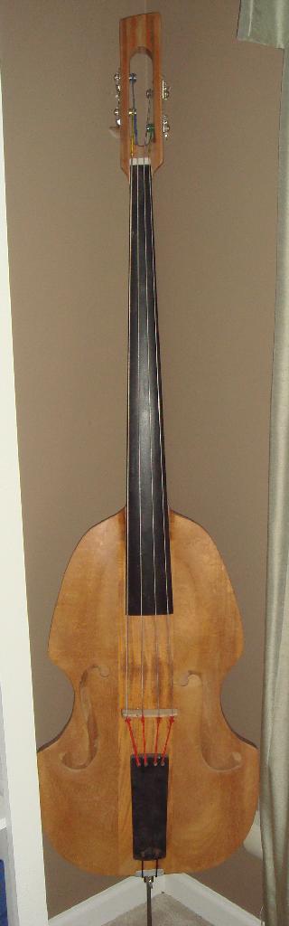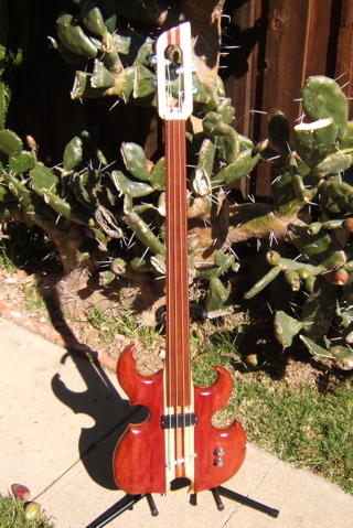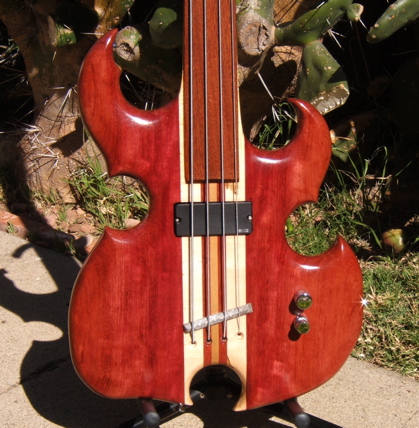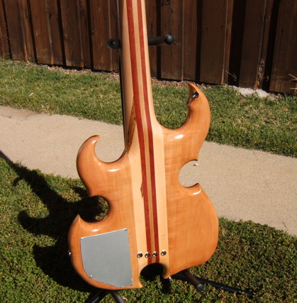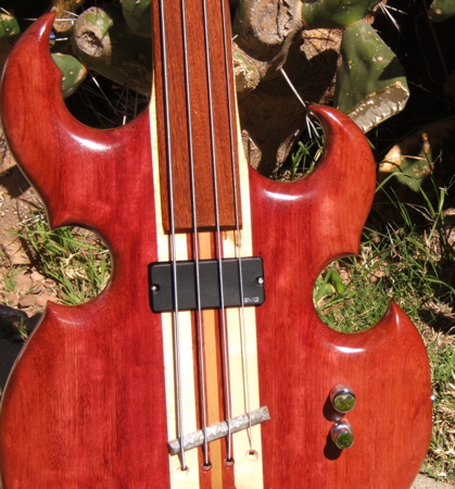 It has a very bright, pinging, hi-fi tone. I have another Wishbass with the same pickup, EMG 35P, that has a much darker, woodier tone. It's a very clear demonstration of the difference that wood makes. Same maker, same pickup, very different tones. This new one has maple and purpleheart laminates in the neck and the same for the body sandwich. The darker sounding bass has maple, mahogany and walnut in the neck, and I don't know what the body is. Something light colored, probably some local tree from a neighbor of Wish's