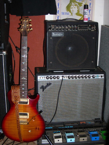 Here's a shot of my latest rig. Mesa Boogie MKIV/Fender Pro-Reverb. I use a Radial ABY switch to use either or both. I run my FXs through the Mesa's fx loop, and keep the Fender at a somewhat clean tone. The Mesa has a JBL. and the Fender has 2 Tone Tubby's, one ceramic, and one alnico magnet. Sounds great..