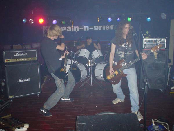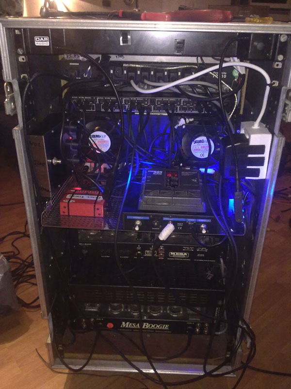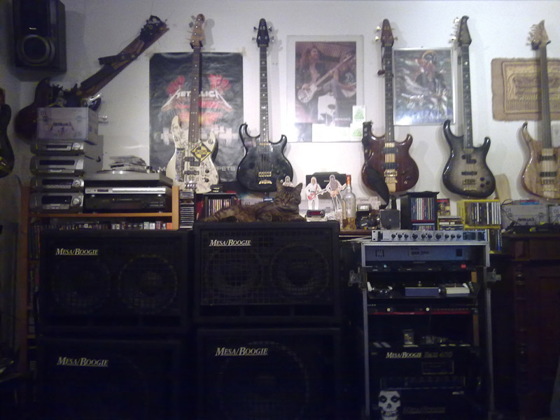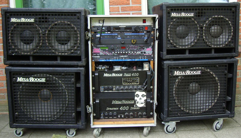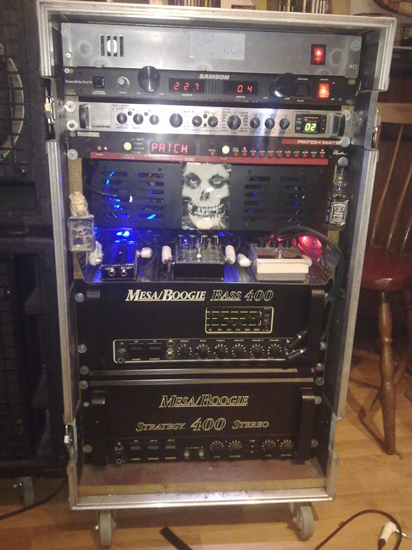 Front of rack from top to bottom:  *Home made power supply for fans and lights  *Samson Powerbrite for all 220V stuff *TC Electronic G-Sharp for chorus, delay and reverb (only during solo?s and only through the Strategy 400) *Rocktron Patchmate for switching effects and routing signal (input 1 & 2 on the Mesa)  Pedals left to right:  *Home made ?interface? unit to connect the pedalboard *Tech 21 XXL for the Jason (Newsted)  solo sound *E-H Little Big Muff for the Jason sound (style 2)  *Mesa Bass 400 (not the 400+)  Channel one: used for the Cliff (Burton) and Jason Wah/Fuzz sounds Channel 2 for all clean sounds  *Mesa Strategy 400: Gets stereo signal from the G-Sharp (G-Sharp gets signal from the slave out of the Bass 400)   Back of the rack: