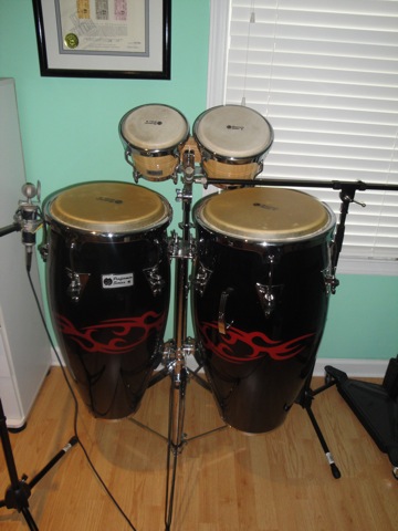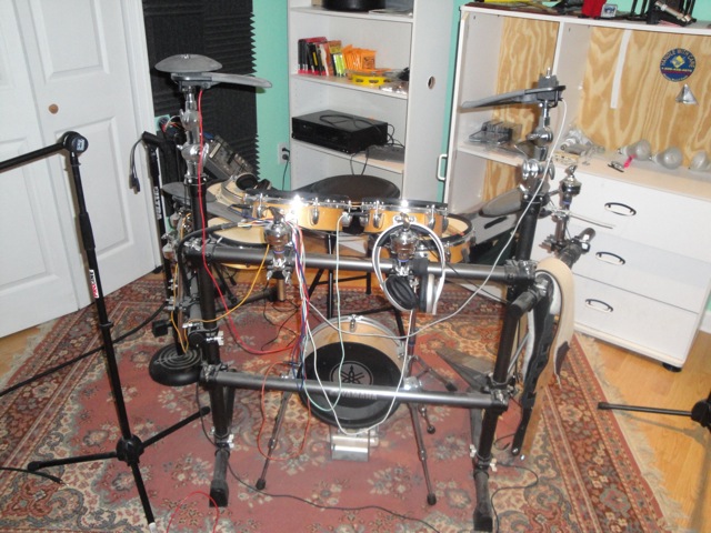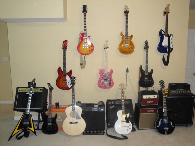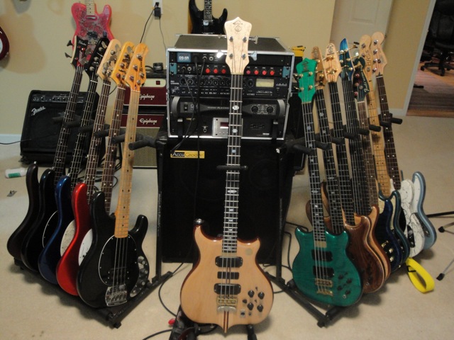 That's a fairly serious bass arsenal; how about some porn for us skinny-string types?  What's left out of the pic besides the pink paisley Tele?