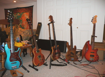 Here's the current family - Warmoth/Status PJ with Villex passives; '73 Guild M-85 with Dark Stars; Brown Bass (every gig, whether or not I bring another bass); Warmoth Mahogany PJ/Aguilar OBP-3; Lakland Skyline 44-02. As I said, the BB is my go-to guy, but I've got a whole lot of alternatives. The Warmoths and the Guild came to me as home-build/restore projects, but are definitely keepers. The Lakland is just a cool surprise. The first ash body I've ever owned - ultralight at 7lb. When the economic skies ever clear, I'd love to build an ebony necked, ash bodied Excel...