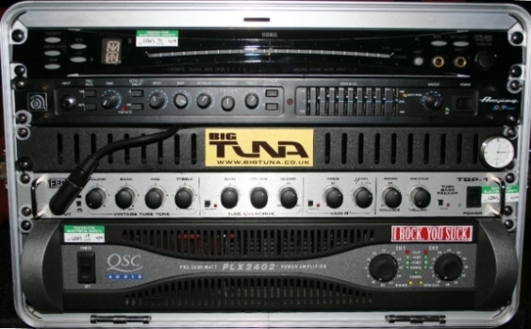 I have 2 Kustom Groove Bass 1200 watt heads, which run my 2 Kustom Groove Bass 4x10's (Live) and 2 2x15's (practice).  I use an Electroharmonix Micro POG (Polyphonic Octave Generator- best octave pedal, ever), the EH Q-Tron, and an EH Bassballs (on the Clean amp- I only kick that on for choruses, and heavier parts).