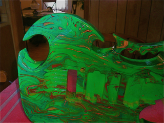 Here's something for the guitar players, every year I build a Guitar or Bass and donate the proceeds to my favorite charity which is St. Judes and have been doing this since 1983. This time I used a Ash body blank and did a swirl paint with hand painted accents by me and made it in the style of a Ibanez Gem with some added custom cuts that were done by the grip and back top of body and front tips. see photo
