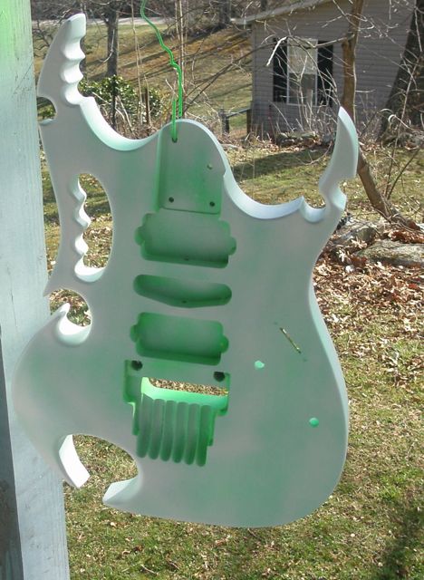 The guitar you see in the pictue lis not Laquered yet but will be finished in a high gloss Nitrocelluose  and buffed to a professional shine, along with Black chrome hardware, pickups and I have a new Ibanez shark tooth neck that was donated for the project with locking tremolo.